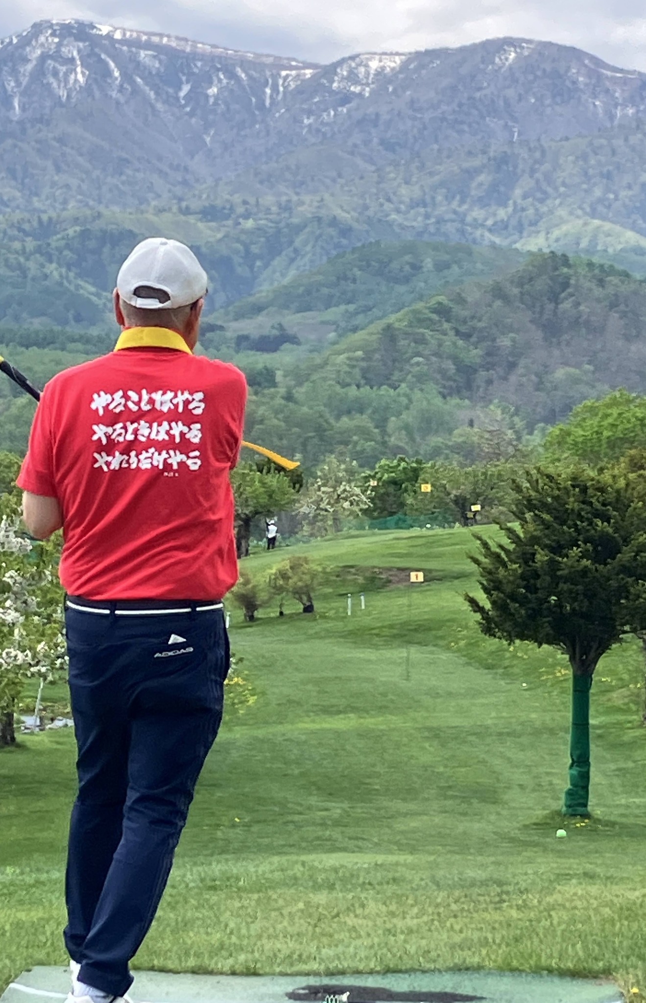 今回の会場は、その名の通り八剣山を麓から間近に見上げ、遠く開けた田園風景を一望できる素敵なコースです。ちょうど緑も鮮やかな頃おいで、プレーしなくとも散歩するだけで楽しめる場所と季節でした。