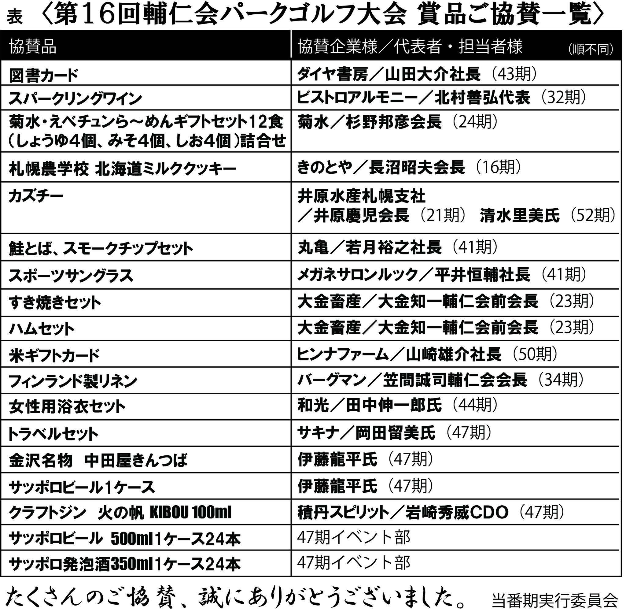午前中に始まった大会は、昼ごろには全員がホール・アウトとなり、場内の施設でジンギスカンに舌鼓を打ちながら表彰式をして大いに沸きました。当番期47期はここぞとばかり、タンブラーやクリア・ファイル、ポーチなど今年のオリジナル・グッズを販売。表彰においても、西高出身者が関わる多くの企業からご協賛頂いた豪華で多彩な景品が、次々と入賞者の手へ渡りました【表】。
